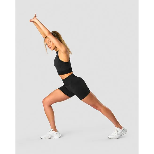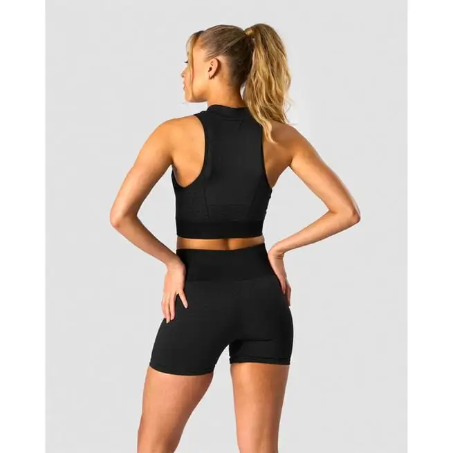 Sømløs crop top med logo-mønster. Signature Collection er en sømløs træningskollektion med et unikt tone-i-tone ICIW-mønster. Materialet er lidt tykkere og mere komprimeret end vores andre sømløse beklædningsgenstande, hvilket giver en perfekt pasform, der bliver siddende på plads. Denne crop-top har ICIW-logomønster på siderne, ribkant i taljen og høj hals.